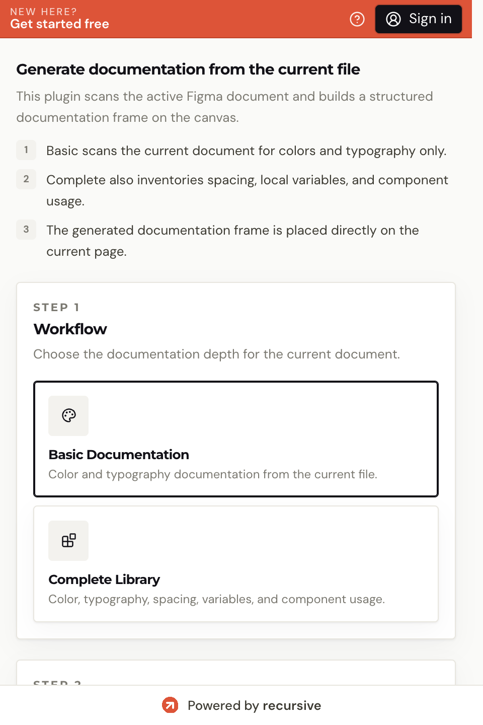 Basic covers colors and typography. Complete adds variables, components, spacing tokens, and usage metrics.